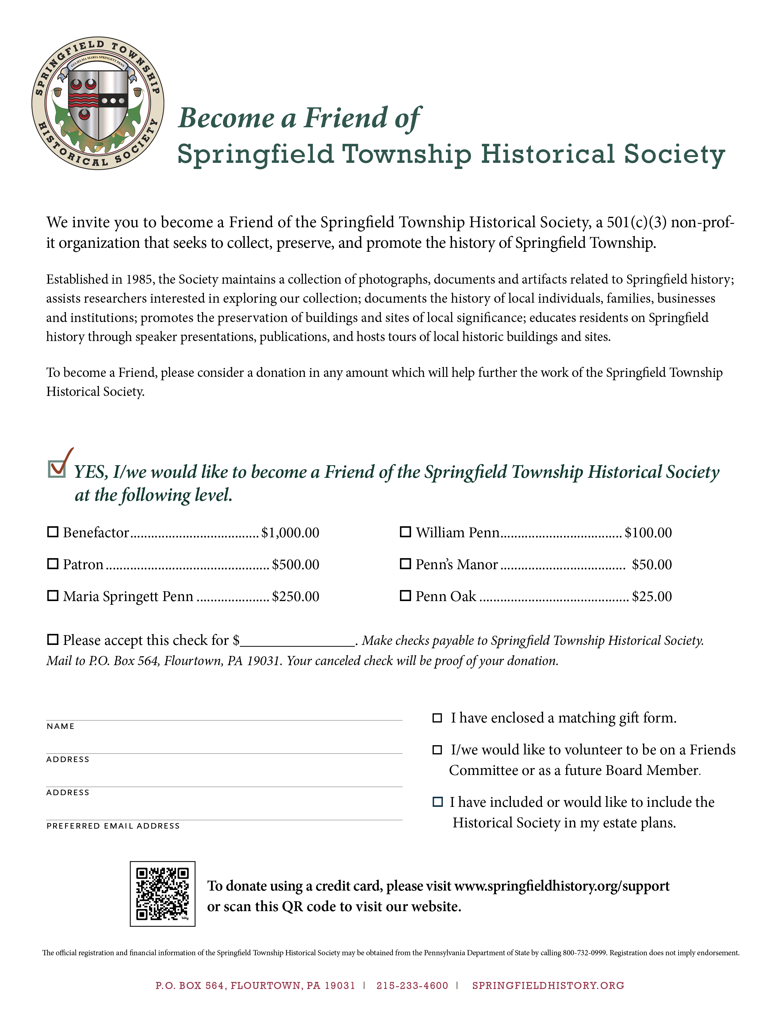 To become a friend, please consider a donation in any amount which will help further the work of the Springfield Township Historical Society. You can use your credit card or PayPal account using the button below.